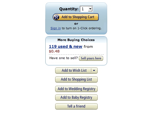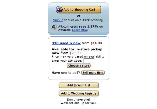 Notice that it’s the same shape, same colors, but now has a 3D effect. The “Ready to Buy” verbiage is no longer there, and the secondary “Buy with 1-Click” button now requires users to log in if they’re to see it. Also, the used book marketplace gets much more screen real estate. They’re also heavily promoting the A9 Search Engine.