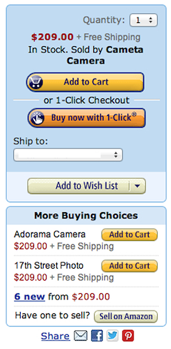 While the Add-to-Cart button stayed the same, with this incarnation, Amazon launched its “1-Click” feature and added it to the “Ready to Buy” area. This design expanded the renamed “Ready to Buy” area to 262 pixels tall.