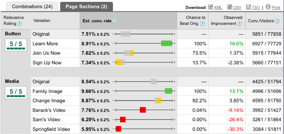 The winning button was the “learn more” button, showing an 18.6 percent improvement over the original “sign up” button. The winning media choice was the “family image,” showing at 13.1 percent improvement over the original “get involved” image. All the videos in the media test actually dropped conversion rates. The combination of using the “learn more” button with the “family image” increased conversion 40.6 percent over the baseline.