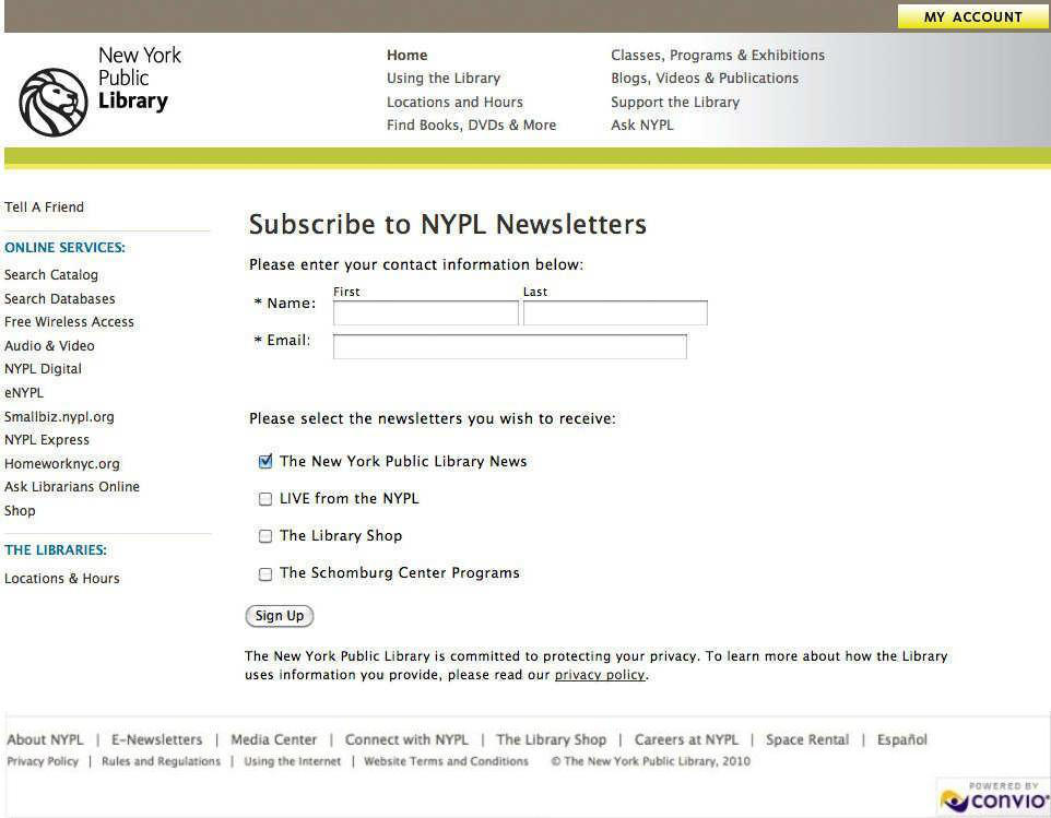 - Call to action. The form was simplified to one field from three fields and a list of check boxes to choose from. Also, the point of action regarding NYPL’s privacy was simplified.