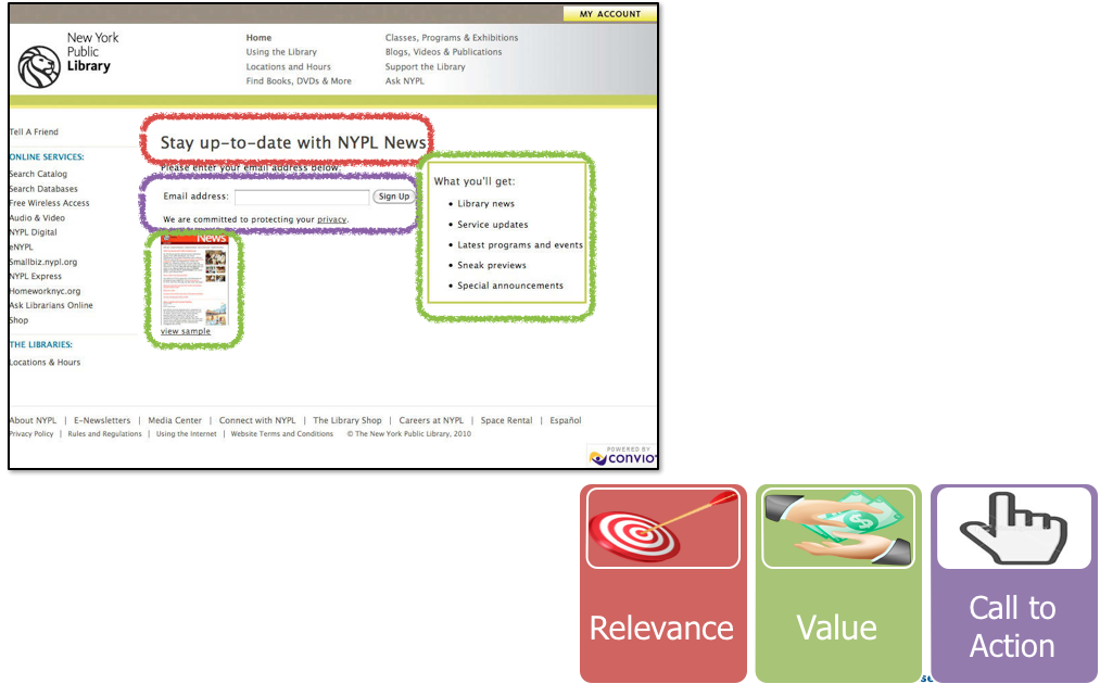 - Relevance. The new headline let’s people know that this is how to stay up to date with the NYPL instead of just telling them to subscribe to newsletters.