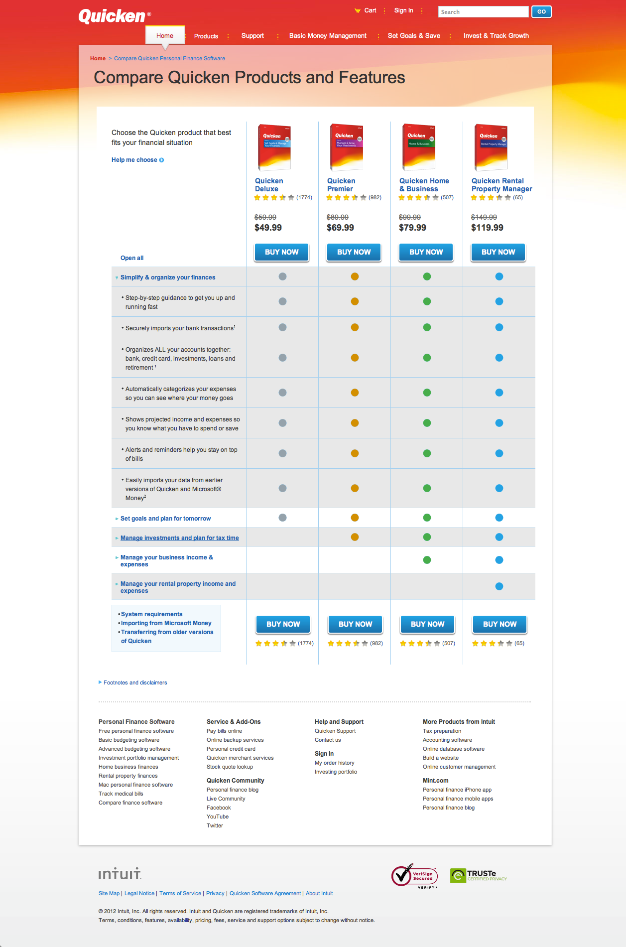 When you overload them with features, they have a hard time zeroing in on anything that might really matter to them. If you have too many benefits to list, then at least group them the way Quicken does, which allows the visitor to open up the group to see an expanded list.
